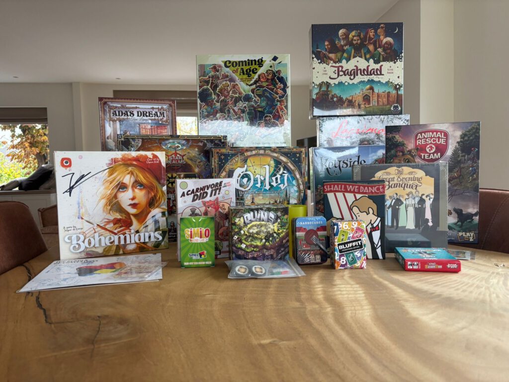 Om 10:00 openen de deuren en daar gaan we! Hugo heeft lijsten bij zich van waar hij allemaal wil kijken en/of kopen, en al is dat gewoon echt moeilijk op zo’n drukke megabeurs, we gaan er best gestructureerd doorheen. Drinken een kopje koffie, spelen een spelletje (alleen of met mensen van de vereniging die we toevallig tegenkomen), kijken uit naar Angela (klant van het vorige werk die we elk jaar tegenkomen en die we tijdens het ontbijt ook in het hotel zagen) en Michiel (oud klasgenoot die ook had laten weten dat ie er vandaag is), en eten een bradwurst. En natuurlijk kopen we ook spelletjes, voor onszelf en voor collega’s. We gaan tot 2x toe even de tassen legen (dat loopt toch echt lekkerder en dan is het zooo luxe als je zo voor de deur kunt parkeren…) en hebben het goed naar ons zin.
