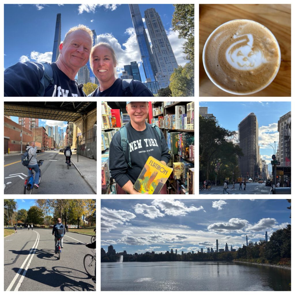 We beginnen de dag met een krentenbol en na een douche (nu met eigen shampoo en een schone onderbroek, de koffer is er!!) gaan we op weg naar een fiets. Want… we gaan een rondje fietsen door Central Park!!
