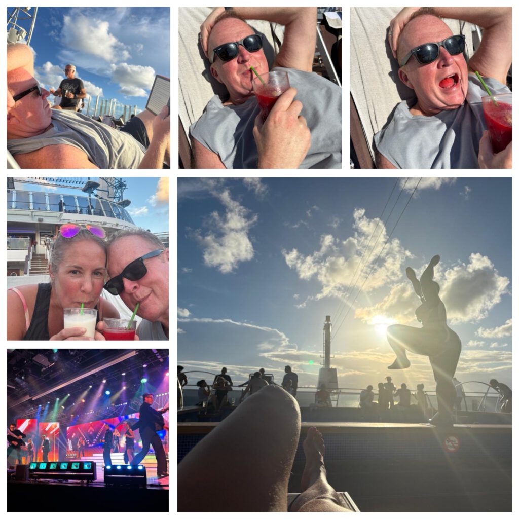 We hebben lekker liggen luieren, boekjes gelezen, Hugo heeft een spelletje gedaan, we hebben gebubbeld, cocktails gedronken en de middag afgesloten met een beetje sportiviteit (in de fitness en op het running track, ook dat is leuk zo op het mooi verlichte schip zo in de pikkedonkere omgeving.