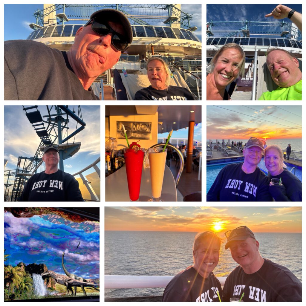 De rest van de dag brengen we best lui door. Boekje, spelletje, en vooral veel mensen kijken. Het is grappig hoe je aan iedereen kunt merken/zien dat het de laatste dag is. Er worden extra veel foto’s gemaakt en veel mensen doen nog een extra rondje. Aan het einde van de middag zie je wel dat het echt leeg begint te stomen (behalve bij de bowlingbaan, arcade-speelkasten en de formule 1 simulator (ik denk dat iedereen zijn tegoed nog op moest maken). Wij blijven lekker buiten zitten (al hebben we inmiddels wel een trui gehaald en ook lekkere dikke sokken, heel charmant onder de korte broek haha) en wachten met een cocktail tot de zon de zee in zakt. Het is er een prachtige middag voor.